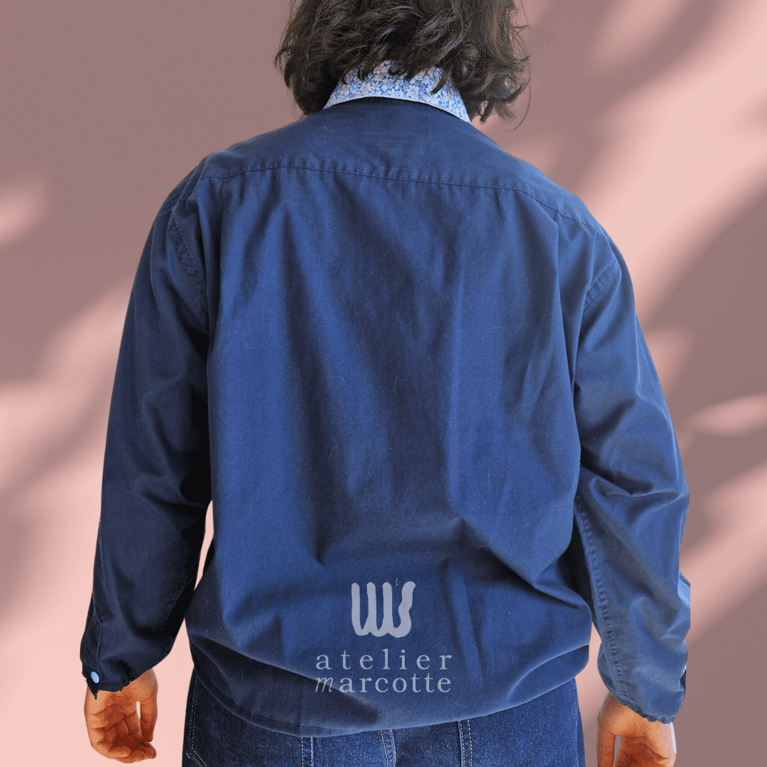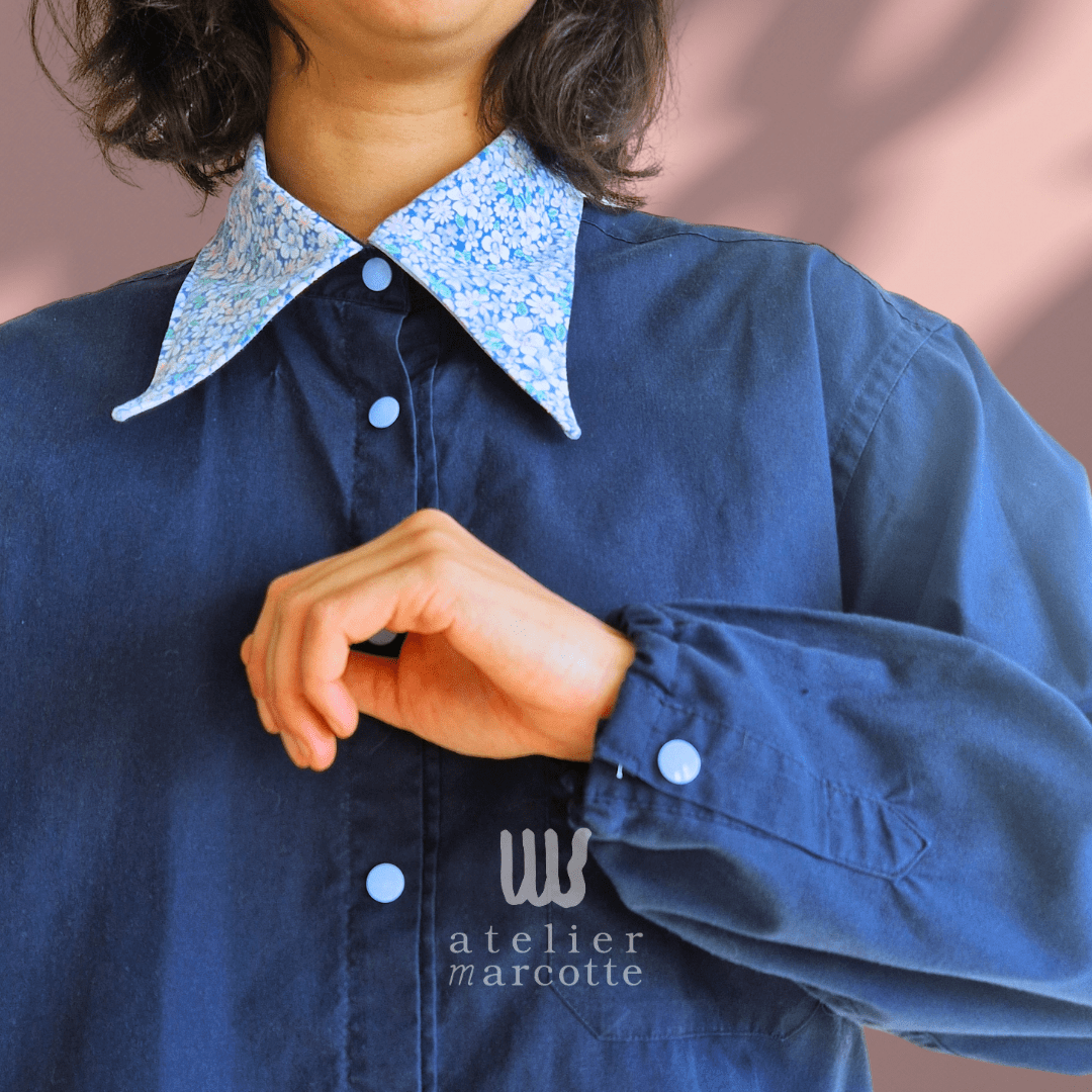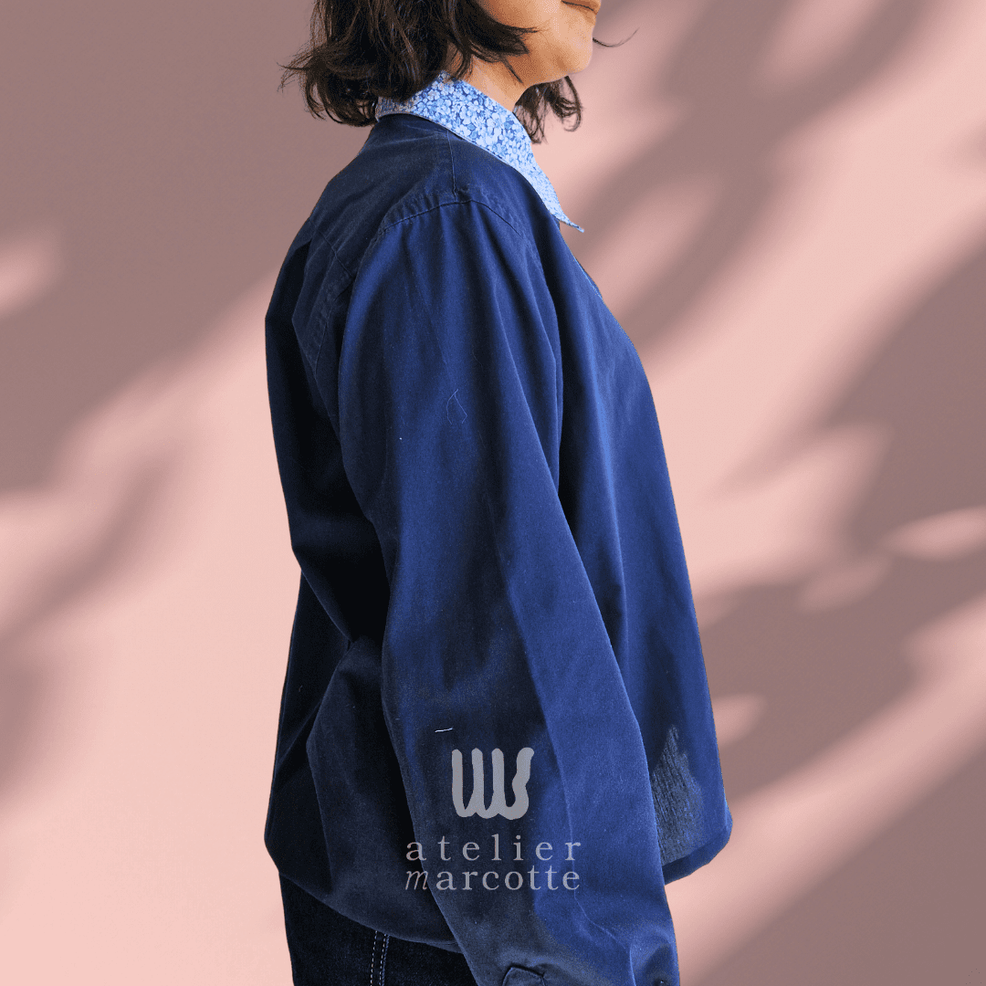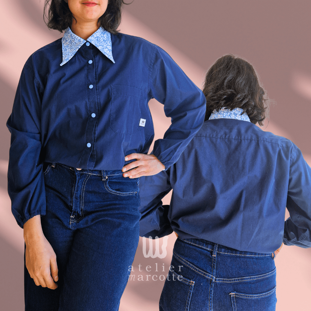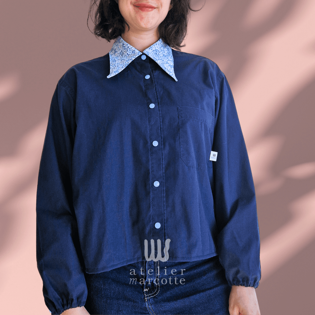 Chemise upcyclée Margaret – bleu nuit et col vintage fleuri